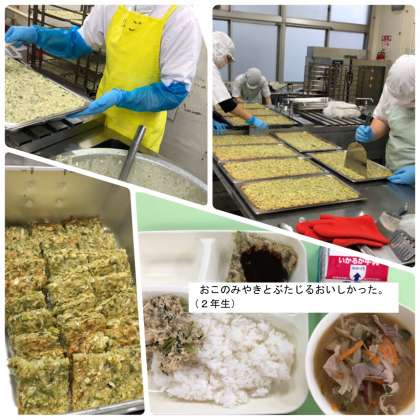 22日の給食には「お好み焼き」、24日の給食には「えびフライカレーライス」が登場しました。