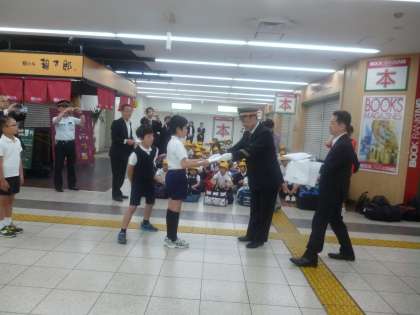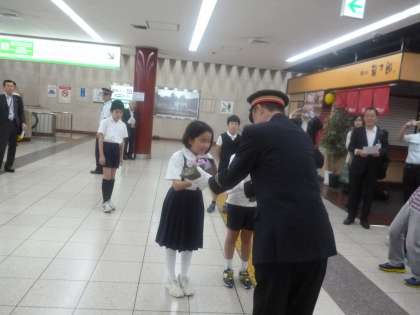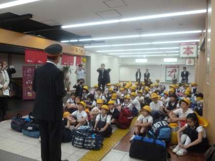 修学旅行専用電車あおぞら号に乗車された保護車の方も多いかと思います。今年の修学旅行専用電車あおぞら号の運転は今日が初日です。毎年一番列車が出るときは、出発式があります。出発式は、駅長さんのあいさつの後、花束贈呈や記念品贈呈などがありました。あおぞら号が無かった時代は、バスでずいぶん時間がかかったこと、あおぞら号ができて利便性が増し、たくさんの人が利用したこと、今あおぞら号は2号になっていることなどを話されていました。また、駅長さんが、谷町線がストップしたことに触れ、旅にトラブルはつきもの、そのトラブルをどう乗り切るかも旅の楽しみである、というようなお話がありました。列車とともに、楽しい思い出をつくってくださいという言葉に見送られながら、ホームへと移動しました。