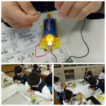 理科の時間に初めて、自分たちで導線や乾電池を使って回路を作りました。作り方の紙を見ながら頑張って回路を作っていますが、中々上手くいきません。