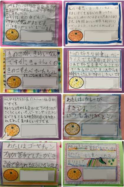 好きな給食、苦手だけれど給食で食べられるようになった食べもの、6年間で一番思い出に残っている給食など、学年ごとにテーマを決めて書いた手紙の一部を下に紹介します。