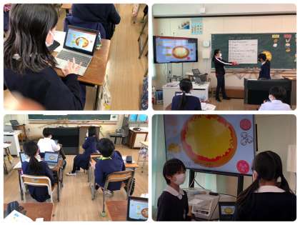 一人一台端末を使って好きなトッピングをのせたピザを作り、二人一組でピザ屋さんとお客さんのスキットの練習をしました。