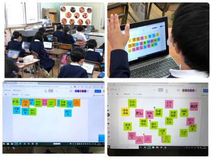 Jamboardを使ったグループ学習を行いました。みそ汁の具をどんどん出していき、次に付箋の色で三色に分類しました。