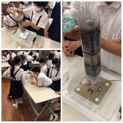 外の見学を終えた後は、実際に泥水を砂に通したり、色水を活性炭に通したりすることで、水がきれいなるかの実験を行いました。