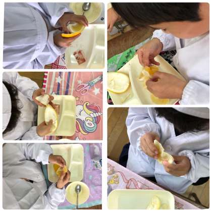下の写真は2年生です。4月のあまなつかんに比べるとむきやすく、食べやすいのですが…。力加減が難しかったかな?