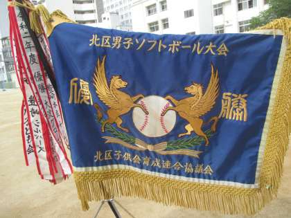 昨日行われました北区のソフトボール大会におきまして堀川小学校と滝川小学校の連合チームが見事優勝しました。暑い中、声を掛け合いとてもがんばっていました。今日の児童朝会では滝川小学校のチームの子たちが優勝旗を授与されました。