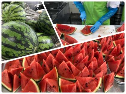 年に1回だけ登場するすいかは。夏が旬の果物です。給食室で1玉を64人分に切り分けています。