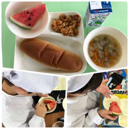 今日の献立は「黒糖パン、牛乳、パエリア、ウインナーとキャベツのスープ、すいか」でした。