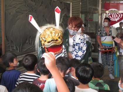 昨日、本日と天神祭りです。花火などは難しいですが、獅子舞の方々が地域をまわっておられます。小学校にも来ていただき、舞を見せていただきました。また、獅子舞に嚙んでもらい御利益もいただきました。
