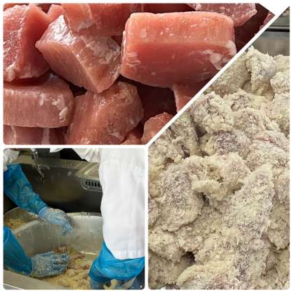 小学校のみそカツは、角切りの豚肉に一切れずつ衣、パン粉をつけて油であげます。八丁みそベースのみそだれは赤みそを加えて食べやすくし、みりん、砂糖で甘みをつけています。