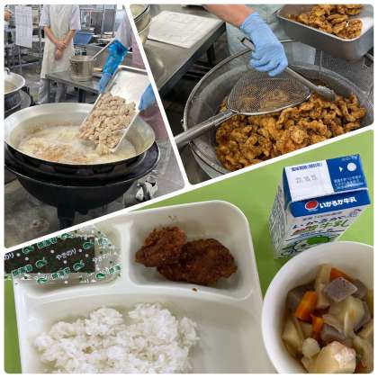 今日の献立は「ご飯、牛乳、みそカツ、じゃがいもと野菜の煮もの、焼きのり」でした。