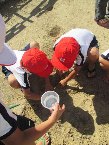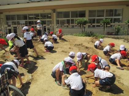 7月16日(木)1年生は、運動場の隅にある砂山を使って、泥遊びをしました。最初は、「よごしていいのかな」と、おそるおそるでしたが、終盤に活発に動くようになりました。砂遊びの後は、1学期最後の水泳学習でした。楽しい1日でした。