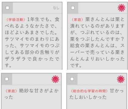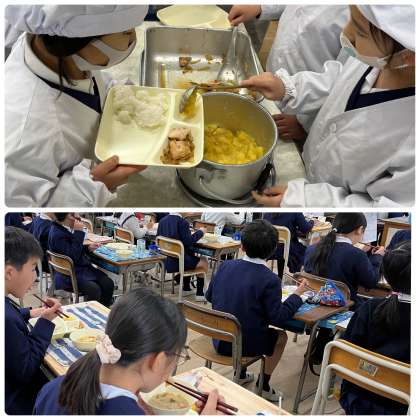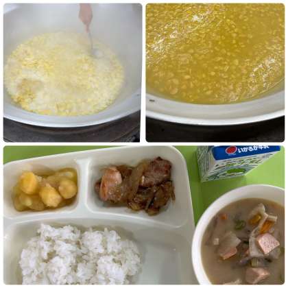 今日の献立は「ご飯、牛乳、鶏肉の甘辛焼き、かす汁、くりきんとん」でした。