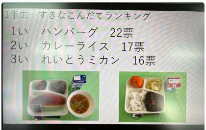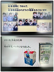 今年度も講堂で発表をすることができないので、給食について調べたことをスライドにまとめ、給食時間に毎日見てもらっています。