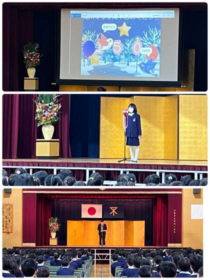 最初に6年生が作成したプロジェクションマッピングが上映され、はじめのことば、校長先生のお話と続きました。