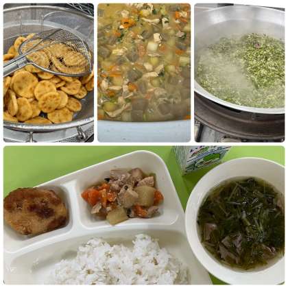 27日の献立は「ご飯、牛乳、鶏肉の土手焼き風、はりはり汁、れんこんのフライ大阪ソース味」でした。