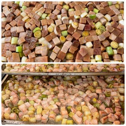 角切りのまぐろは、旬の白ねぎと一緒にみりんやこいくちしょうゆなどで下味をつけて焼いています。