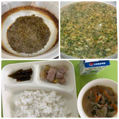 今日の献立は「ご飯、牛乳、まぐろの甘辛焼き、豚汁、茎わかめのつくだ煮」でした。