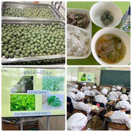 今日の献立は「ご飯、牛乳、豚肉と野菜のいためもの、すまし汁、きな粉よもぎだんご」でした。