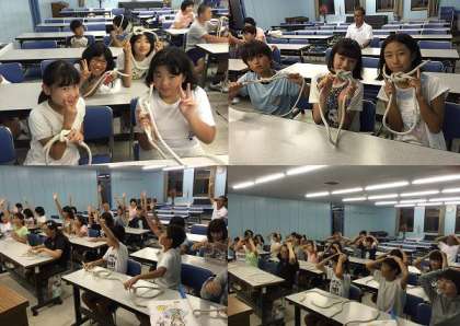 ロープワークの時間です。明日のいかだづくりで使う技をいろいろを教えてもらっています!まずは本結び!みんな合格しました!結び競争では、みんな手を頭にあげ、レディーゴー!3秒くらいで結ぶツワモノが現れました!
