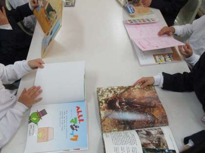 初めて図書室に行きました。たくさんの本の中から自分がかりる一冊を選ぶのは一苦労です。みんなにこにこしながら本を選ぶことができました。
