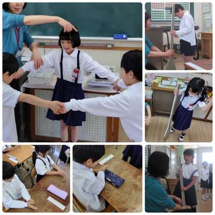 焼きそばを題材に家と学校で使う道具や材料にどのような違いがあるかを考え、からだを使って釜の大きさを確認したり、たまねぎを切ったりしてみました。