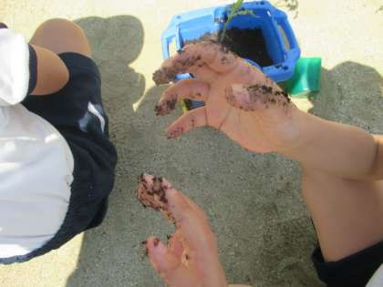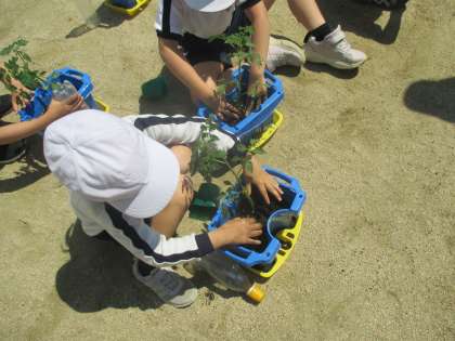 今日は管理作業員さんにも手伝っていただき、ミニトマトの苗を植えました。真ん中になるように植え、最後にお水をあげました。「手がどろだらけ〜」「ゾンビの手みたい〜」といいながら楽しく学習することができました。