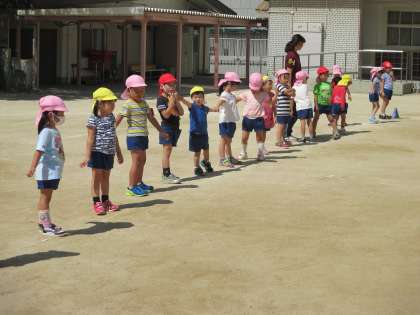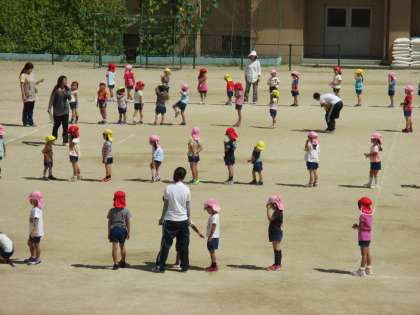 お弁当の後、小学校の運動場では幼稚園の子どもたちの元気な声が響いています。運動会の練習を小学校の給食時間にしています。広い場所に慣れるため、自分たちの場所を覚えながら頑張っています。たんぽぽ組さんは初めての、ばら組さんは最後の運動会です。当日どのようなかっこいい姿を見せてくれるか楽しみです。