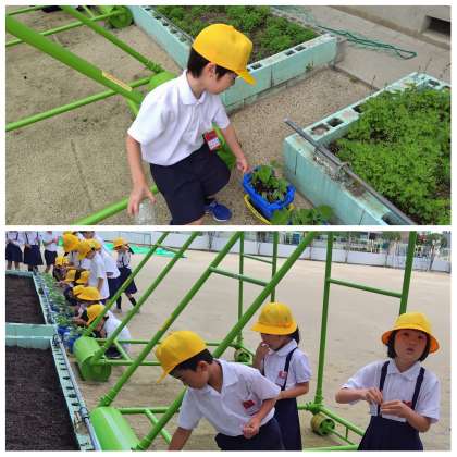 1年生が大切に育てているあさがおに大きな葉っぱが出ました。