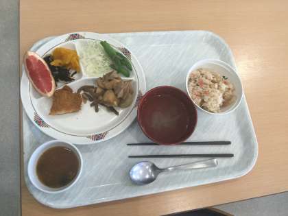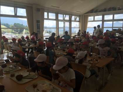 1日目の食事はバイキングです。ついついとりすぎてしまいます。1年生もお盆をしっかりもって料理をとりました。とても賑やかでしたが、感謝の気持ちをもって食事をしました。