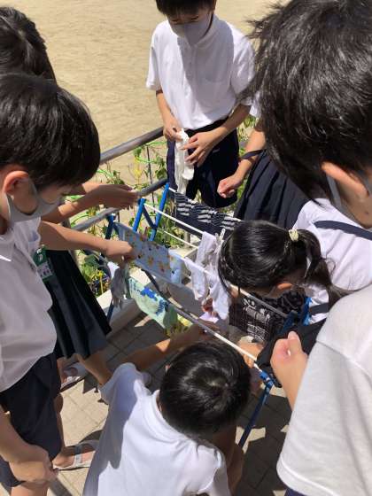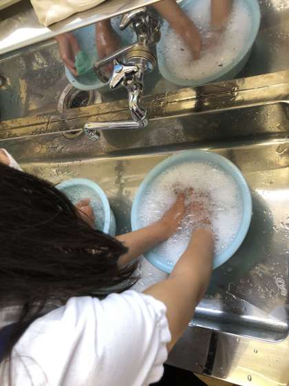 洗濯桶を使って、靴下とハンカチを洗いました。今はなかなか見なくなった粉せっけんを使い、一生懸命もみ洗いをして汚れを落としていました。
