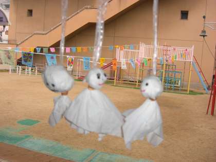 子どもたちが、思い思いの運動会遊びを描いた万国旗。