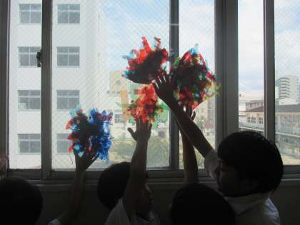 2年生は図工の学習で、お花紙と洗濯のりをつかった工作を