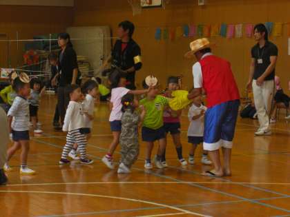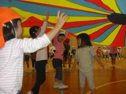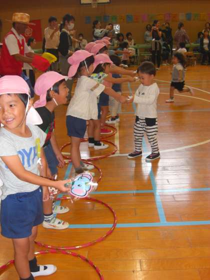 10月9日は、チャイルド運動会でした。今年もたくさんのおともだちが遊びに来てくれました。体操にかけっこ、玉入れと一緒に体を動かして楽しみました。パラバルーンの中に入ったときのうれしい声やかけっこのゴールでプレゼントをもらった時のうれしい顔、お兄さん、お姉さんとして喜んでもらえたうれしい気持ち、うれしい楽しいがいっぱいあったチャイルド運動会でした。