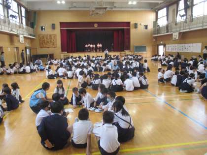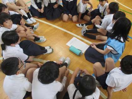 今日は、班ごとに分かれてクイズの答えを考えました。答え合わせでは、集会委員会から一つの答えが発表されるたびに喜ぶ児童が多くみられました。