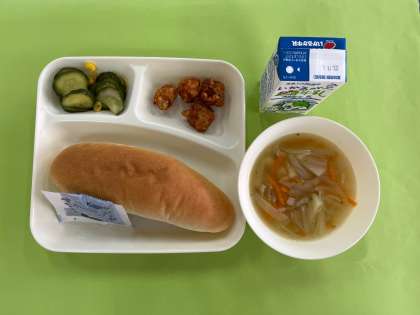 今日の献立は「コッペパン、牛乳、まぐろのオーロラ煮。スープ、きゅうりとコーンのサラダ」でした。