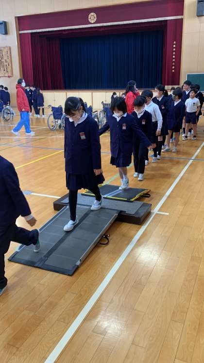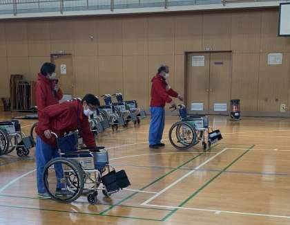 リハビリテーションセンターの方にお越しいただいて車いす体験を実施しました。まずは説明を聞き、コースを歩いてみました。