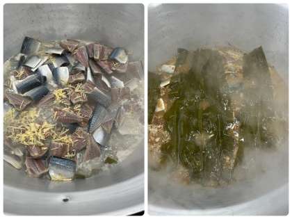 さばは大きな釜でことこと炊きます。だしこんぶを釜の底に敷き、落し蓋にも使っています。小骨もあって食べづらい献立ですが、ピカピカお皿にできたでしょうか。
