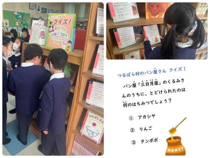 女の子が見ているクイズは下の写真(右下)です。答えは図書室で見つけてくださいね。