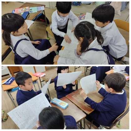 「。」「、」「改行」「むかしむかし」「一マスあける」など間違いがないか、お互いに確認しあい、清書しました。