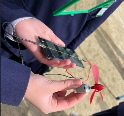 今日は光電池を使って、太陽の光で発電する実験をしました。