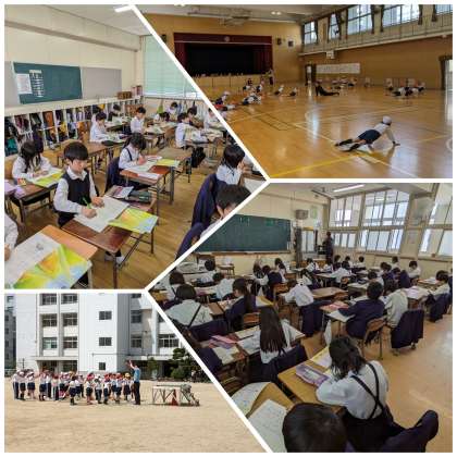 2年生の体育は運動場と講堂に分かれて、クラスごとに授業を行いました。運動場では全面を使ってかけっこ、おにごっこをしました。講堂では動物になりきって、体の動きを工夫しました。久しぶりの運動なので、筋肉痛が起こるかも…。
