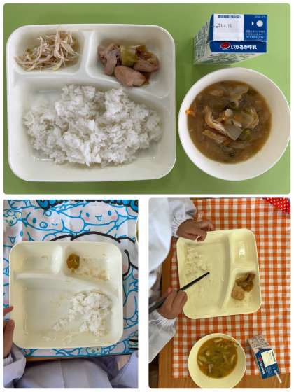 下の写真は1年生の食器です。「もやしが苦手だけど、食べた!」「ゆずが苦手だけど、食べた!」
