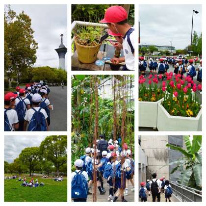 雨が降るかも…という心配もありましたが、「鶴見緑地」は天気も良く、風もあるので、とても心地よく楽しむことができています。この「鶴見緑地」は今から34年前の1990年に開催された「国際花と緑の博覧会」の跡地を整備してできた公園です。子どもたちは公園内にある「咲くやこの花館」でクイズラリーをしながら、植物の多様性を学びます。芝生のひろばにでかけ、木陰に入って楽しみのお弁当タイムが始まりました!しっかり学び、しっかり食べ、しっかり遊んで学校に戻ります。