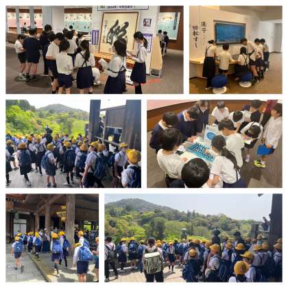 5年生の遠足は京都に出かけました。はじめは八坂神社に近い「漢字ミュージアム」を見学しました。まず目につくのが迫力ある「税」の文字です。これは2023年の「今年の漢字」で、清水寺貫主の方が書かれました。その清水寺にも出かけました。とても暑い中でしたが、舞台の眺めは素晴らしく、爽快な気持ちになりました。人々が脈々と受け継いできた歴史を感じることができました。
