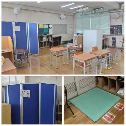 主にパーテーションは一人一人が集中して学習に取り組めるように使いますが、2枚のパーテーションを組み合わせると……着替えスペースに大変身!!