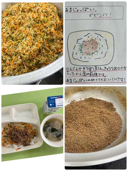 本日配布の「食*はぐくみ通信」で給食についてのおたよりの紹介をしています。作り方なども確認できます。ビビンバも簡単においしくできるので、ぜひ、チャレンジしてみてください。