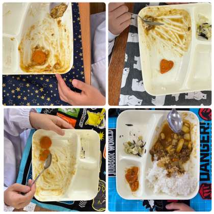 カレーライスにはかわいい形のラッキーにんじんが入っています。今日はハート、花、さかな、車の4種類でした。