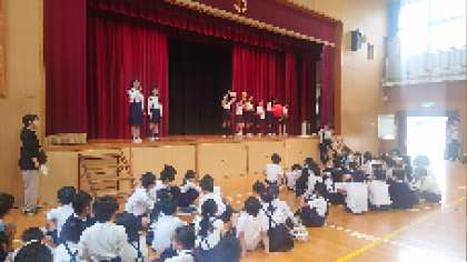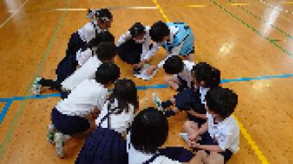 舞台のカーテンの間を通過するものをしっかりと見て、班で話し合っていました。