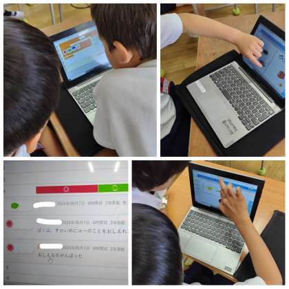スクールライフノートの振り返りも、天気のイラストを1年生。コメントを2年生と分担しながら入力することが出来ました。