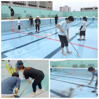 来週のプール開きに向け、教職員でプール清掃を行いました。